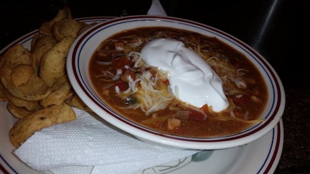 Now we are ready to build our bowl of chili. I always like to top my chili off with shredded cheddar cheese and a dollop of sour cream. Grab a handful of Fritos or a square of cornbread and you are ready to go!