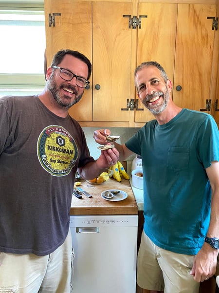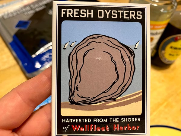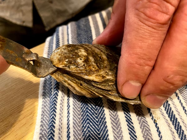 He picked up two dozen oysters, brought them back to the house, and because there wasn’t an oyster shucker available, he learned that using a church key actually works extremely well for shucking oysters. Who knew?