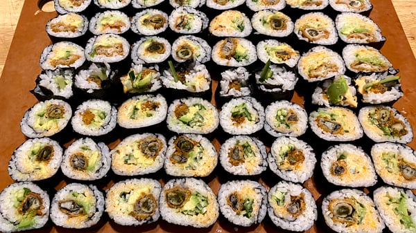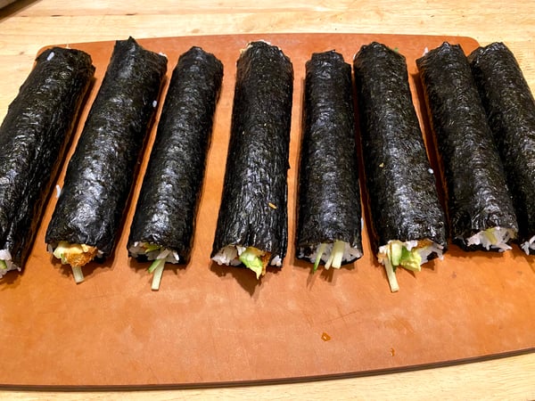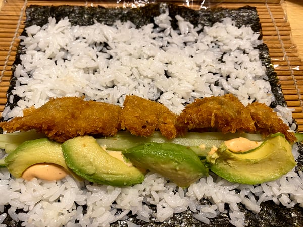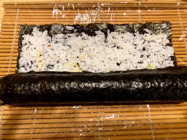 - About 2-inches up from the bottom the roll, place your fillings along the rice. Position your thumbs under the mat and place your other fingers on the ingredients to keep them in place. Using your thumbs, bring the mat up and over the fillings. Remove your fingers from the ingredients so you can “tuck them in.”