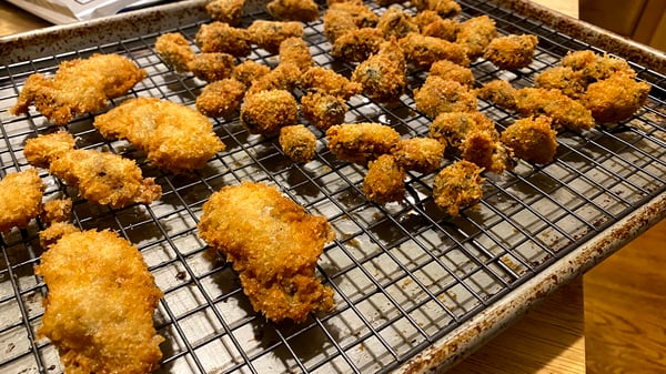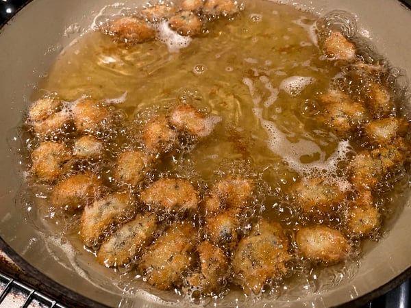 5. Fry the oysters, in batches if necessary, until golden brown and crisp. Using a slotted spoon, transfer the oysters to a cooling rack set over a sheet tray or a paper towel-lined plate.