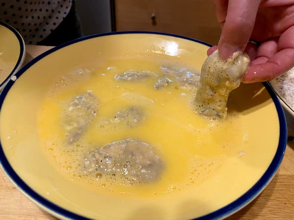 To prepare the oysters for frying, my husband shucked them (once again using a church key), and I three-step breaded them. This includes a shallow dish of all-purpose flour, beaten eggs and panko breadcrumbs, and to make sure we didn’t waste the delicious oyster juices, we added them to the egg wash.