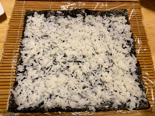 - Dip your fingers in cool water to prevent the rice from sticking to your hands, and gently spread the rice on the full sheet of nori, leaving a 1-inch strip without any rice on the end furthest away from you.