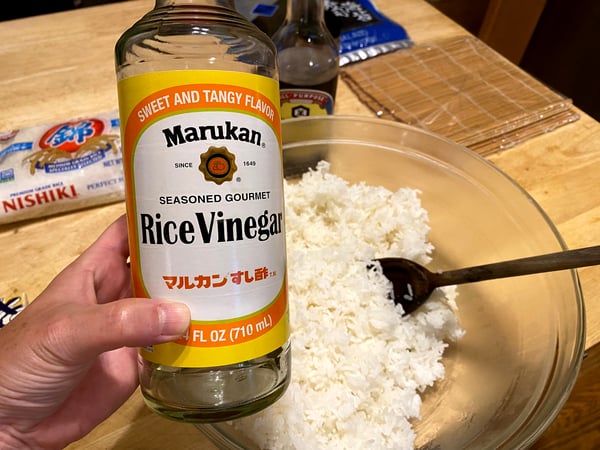 - Cook the rice according to the recipe on the packaging. Once the rice is done, transfer to a large bowl or baking dish, and season with just enough of the seasoned vinegar until the rice is glossy and flavorful, approximately 1/4 to 1/3 cup. Cover with a damp towel to prevent the rice from drying out. Set aside.