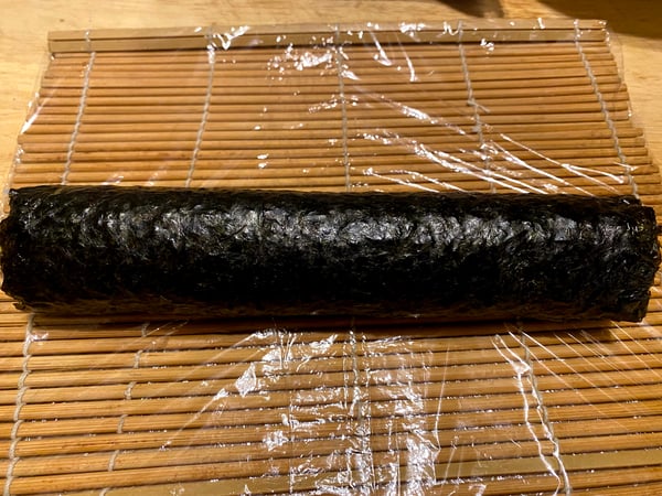 6. To make the maki rolls, place a sheet of nori, shiny side down, on a plastic wrap-wrapped bamboo rolling mat. Note: Wrap the mat in plastic to prevent rice getting stuck in between the slats.