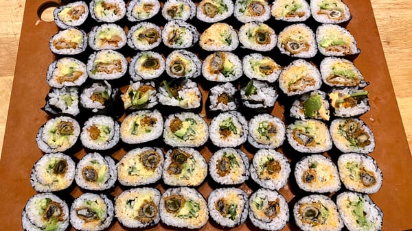 To ensure the flavor of the oyster came through, I kept the maki rolls very simple. I added cooked sushi rice dressed with seasoned rice wine vinegar, thinly sliced cucumber, avocado and a touch of spicy mayo (mayo mixed with Sambal or Sriracha).
