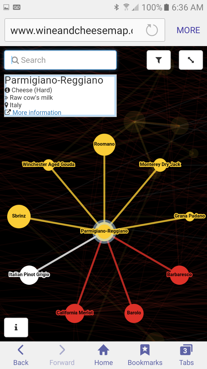 I recently rated three mobile wine apps I felt helped me in selecting wine and tracking my tastes. I wanted to follow up on that with a second post about finding the right cheese pairings for wine. Unfortunately, I was only able to find one app I liked and it performed more like a reference guide than a tool that allowed me to explore options. I was about to scrap the idea completely when BBC News, Toronto posted an article about a biochemist who had adapted a computer model for tracking gene/molecule interactions for pairing fine wine and cheese. Using Max McCalman's book Cheese: A Connoisseur's Guide to the World's Best as its reference, the site demonstrates relationships between 100 different wines and 270 cheeses. It was like a last minute Christmas present, just for me! So, for the past month I've been using this Wine and Cheese Map as a guide to my wine and cheese purchases... you know, for science.