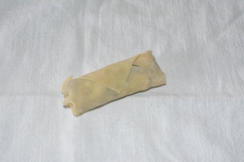6. Roll tightly – until you get to last corner. Using a wetted fingertip – wipe finer across tip of wrapper to help form a seal and roll completely – placing tip facedown on work surface. Finish all egg rolls.