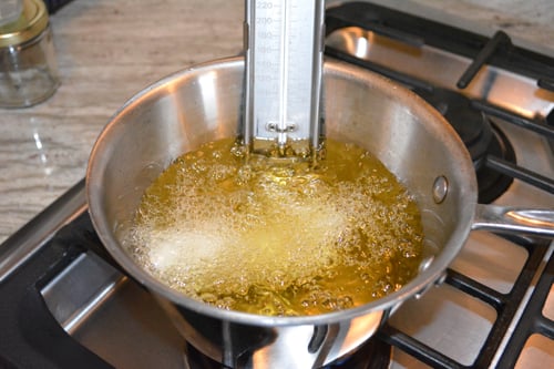 8. Pour oil no more than ½ up the sides of a deep pot. On stovetop over medium heat, bring oil in pan to 350° - be sure to use the thermometer – safety first!)