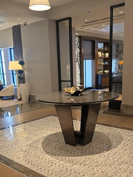Now, fast-forward to April 2025. The couple scheduled a walk-through of the venue that included themselves, their caterer, their DJ and me. It was a stunning location! We made some decisions on how things would be set up and, still wanting the cake to be a focal point, they decided to locate it on this beautiful entryway table, where the guests would walk by it as they were welcomed into the reception with a glass of Champagne. Okay… no pressure at all!