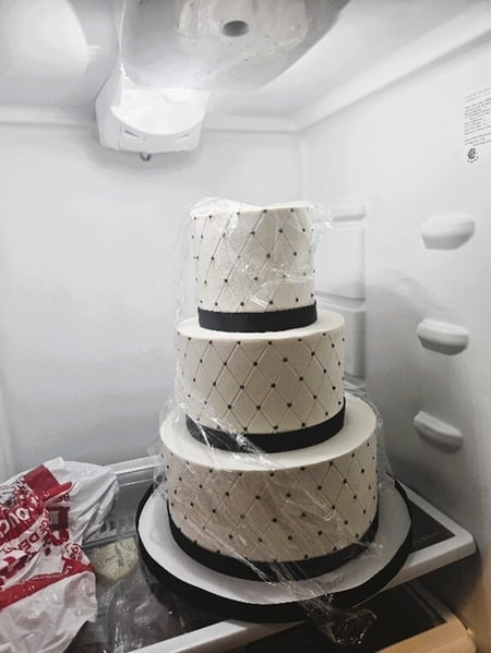 Finally, I moved the 12” tier to a thick, inflexible cake board (a “cake drum”) and stacked the tiers. I affixed 1” wide black grosgrain ribbon around the base of each tier to add some dimension, as well as around the cake drum. I removed the middle shelf of my refrigerator to set the cake inside. The fridge had been open and closed a lot and the cake had come down in temperature a bit with the final touches, so I draped it loosely with a bit of plastic wrap just in case any condensation formed and dripped.