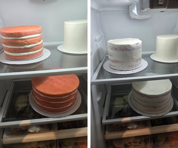 After the buttercream was made, I decided to assemble and frost the 6” tier. I pulled the 6” layers from the chest freezer, filled the layers with pink buttercream, leveled out the tier, and “crumb-coated” it. Once it had set up in the fridge for about 30 minutes, I then frosted the entire tier with white buttercream, smoothed it, and returned it to the fridge.