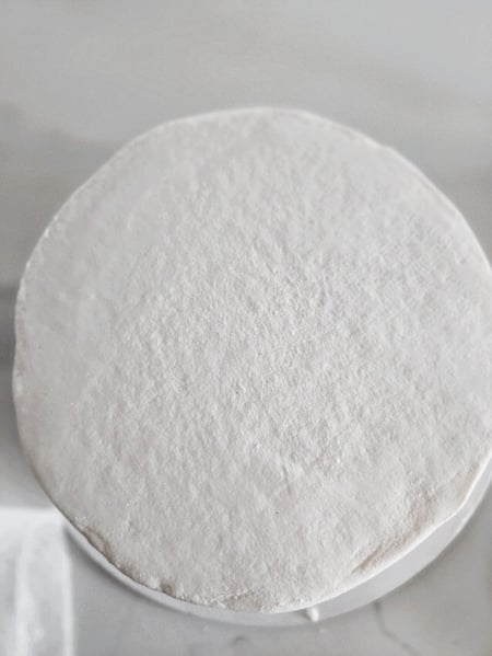 You can see in the photo that the sheet on top has an embossed wave in it. The bottom sheet is the reverse side and, while you can see some difference, it’s actually much smoother than the photo shows; the waves you see are showing through from the other side. This smoother side is the one that will be placed against the frosting. I frosted a demo cake to show you the difference it makes – and how quickly it smooths out! Here is the top of the cake with the unsmoothed buttercream.