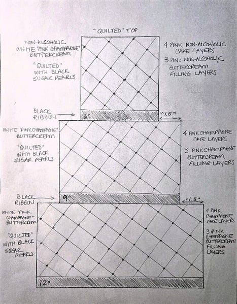 Their wedding was going to be black-tie formal, so the cake needed to fit into the black and white theme. They also wanted the cake to be a focal point at their reception, which was going to be in a beautifully renovated Art Deco-style building. They were looking for something dramatic, but with a sort of understated elegance. To that end, they didn’t want any floral embellishments or fancy add-ons; they wanted the cake to stand on its own. After discussing several design options, we decided on an embossed quilted diamond pattern around the sides of the tiers and across the top.