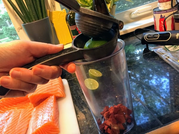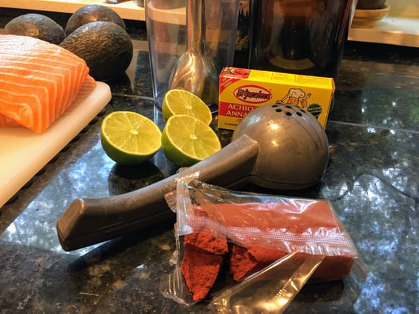 - In the jar of a blender, combine the achiote paste, olive oil and lime juice. Blend until smooth. You can alternatively use an immersion blender to make the marinade.