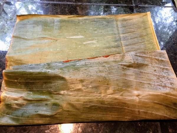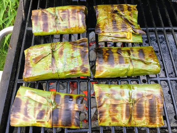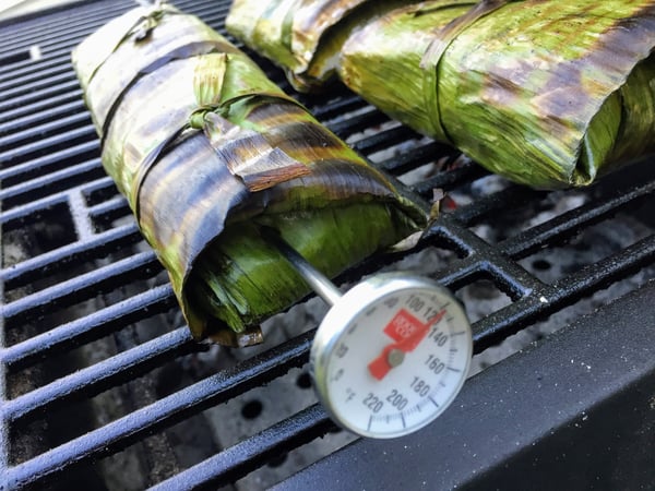 - Use a meat thermometer to tell when the fish is done; it pokes through the banana leaf very easily.