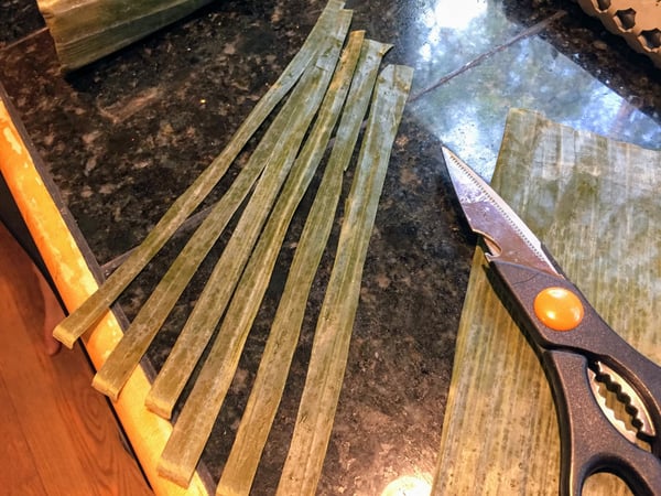4. To secure the packages, cut the banana leaf, with the grain, into 1/2-inch-thick strips. If the strips are not long enough to go around the wrapped fish, you can tie two strips together.