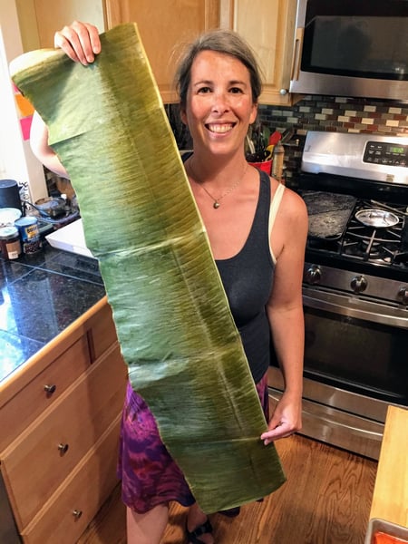 First of all, banana leaves are a Latin American and Southeast-Asian ingredient used to wrap foods; basically, wherever bananas grow you’re going to find banana leaves. You can bake, grill, roast and steam foods in a banana leaf, and they impart a delicate, earthy and fruity flavor without being overwhelming. The leaves are very sturdy and easy to work with, so there’s no need to worry about them ripping. You can always find them at Latin and Asian markets in the freezer section, but our local grocery store, Valli Produce in Evanston, is very diverse and stocks them in the freezer aisle with some other Asian ingredients.