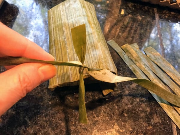 - To secure the packages, cut the banana leaf, with the grain, into 1/2-inch-thick strips. If the strips are not long enough to go around the wrapped fish, you can tie two strips together.