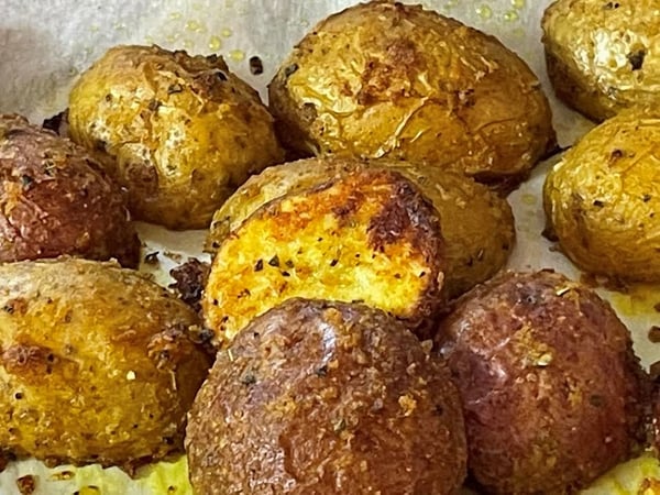 7. Bake for 30 minutes. Take a peek to make sure they are browning not burning. I cooked mine for a total of 40 minutes because I like my potatoes well done. Some people prefer to shake up the pan while cooking. I prefer to leave it alone.