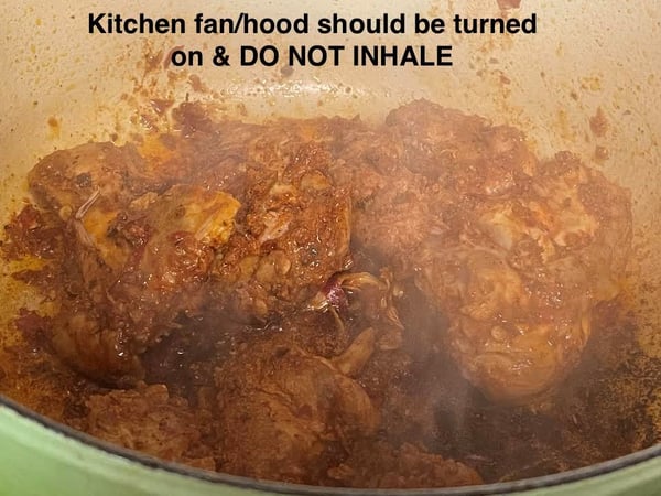 - Add the chicken. Sear both sides. Step back so you don’t get hit in the face with essence de chili and become delusional as you write up a blog about chicken adobo.