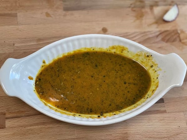 8. In a food processor, process together the garlic, spices, a pinch of salt, vinegar and chiles.
