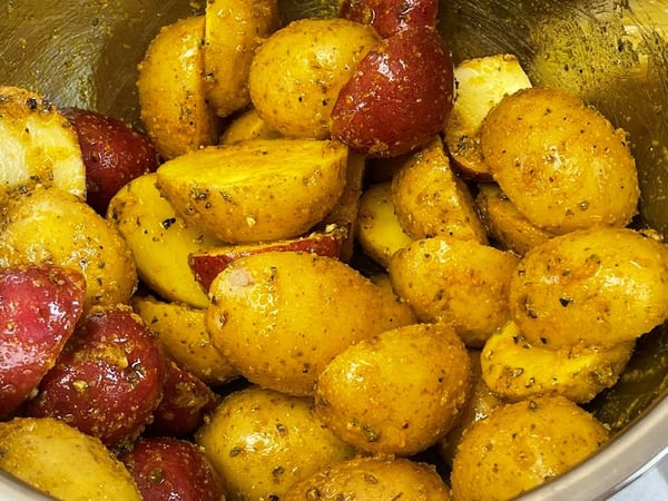 5. Place the cut potatoes into a large bowl, toss the potatoes with seasoned olive oil mixture. Make sure every potato is coated. It should look a little bit shiny. If it isn’t, feel free to drizzle on a little more oil.