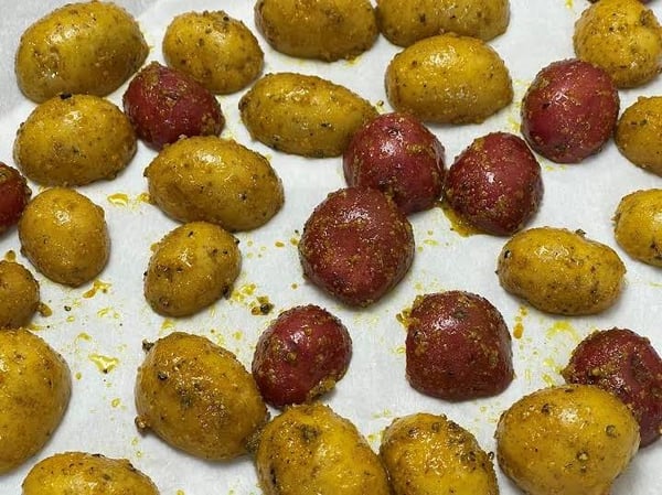 1 1/2 pounds of baby potatoes, cleaned and cut in half