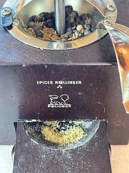 6. While the chiles are rehydrating, grind the cumin and peppercorns. I use my cute little spice grinder.