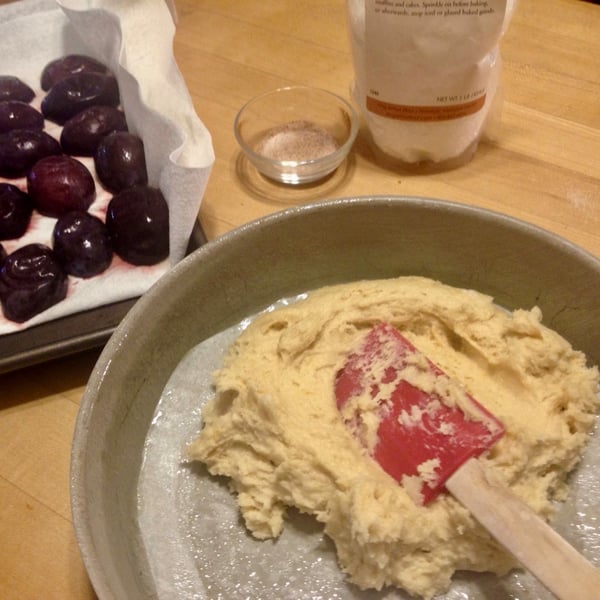 4. Smooth batter into prepared baking pan. The batter will be stiff; use a spatula to nudge it to the edges of the pan. Spread chopped fruit over the batter, or arrange sliced fruit like apples or peaches on top by inserting them into the batter rounded side up in a spiral pattern. Sprinkle top with coarse sugar and cinnamon mixture.