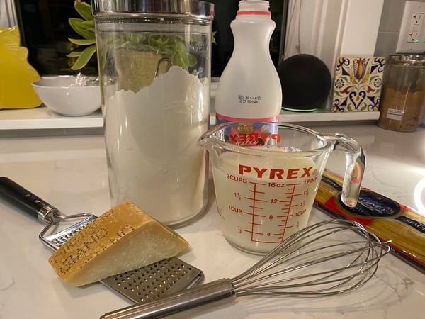 In order to create a healthier-yet-delicious version of this sauce, we only need 4 ingredients for the recipe: skim milk, flour, garlic and Parmesan cheese. Yup… we’re entirely skipping the butter and cream.