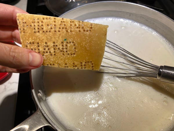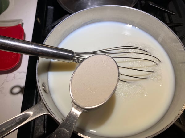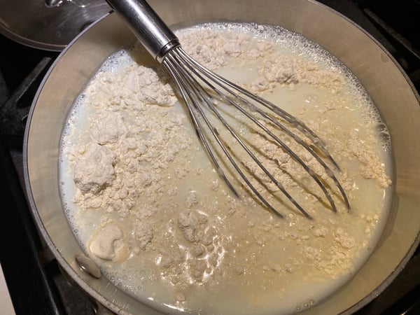 - In a saucepan, whisk together the cold milk and flour until combined. Set over medium-low heat and cook, whisking very frequently, until the sauce starts to thicken and is bubbling.