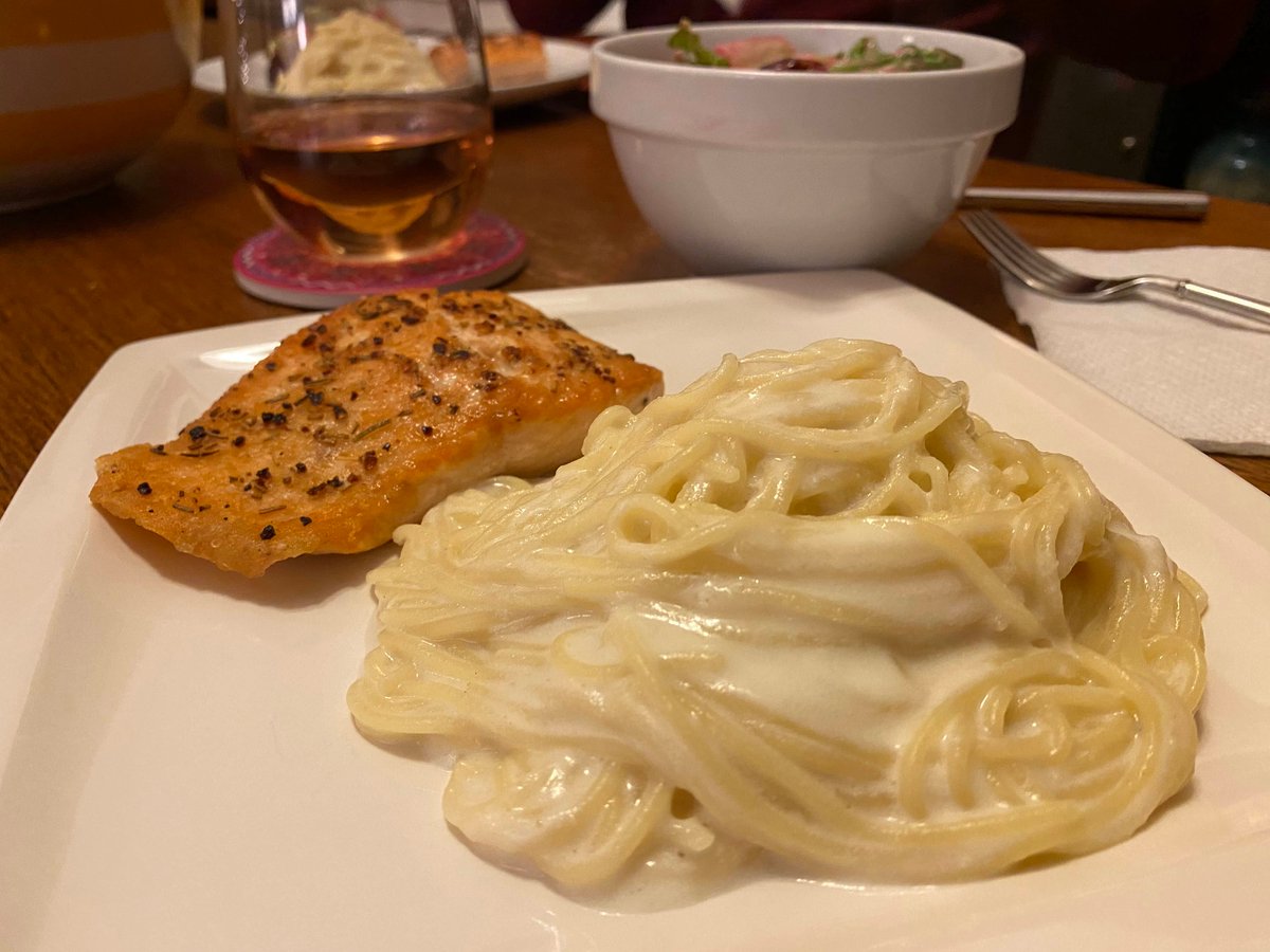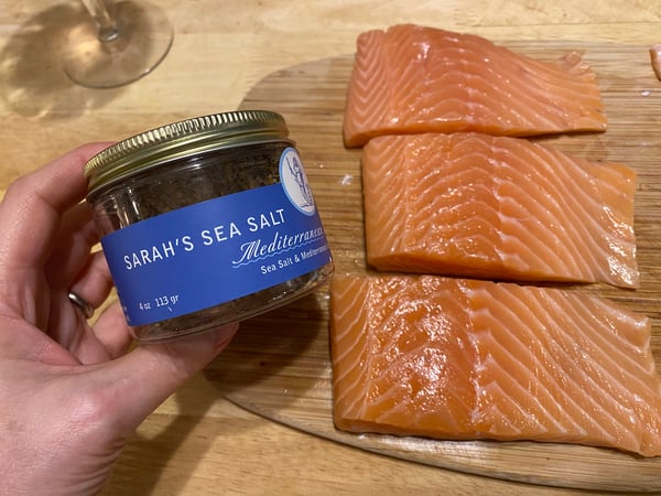 Speaking of fish, and in order to make this a more balanced meal, I served sautéed salmon fillets seasoned with Sara’s Mediterranean Sea Salt (my favorite salt blend we sell at TCB) with the pasta Alfredo along with a side salad with roasted beets and candied pecans.
