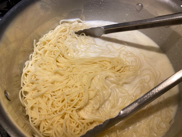 I tossed the Alfredo sauce with spaghetti, because that what I had on hand, but any choice of noodle would be yummy!