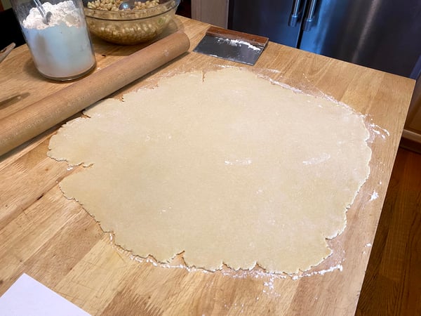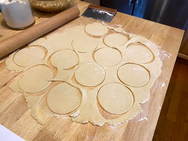 Roll the chilled dough out on a floured surface to around an 1/8” thickness, and use a biscuit cutter to cut out 4- to 5-inch circles (you should end up with about 12 circles).