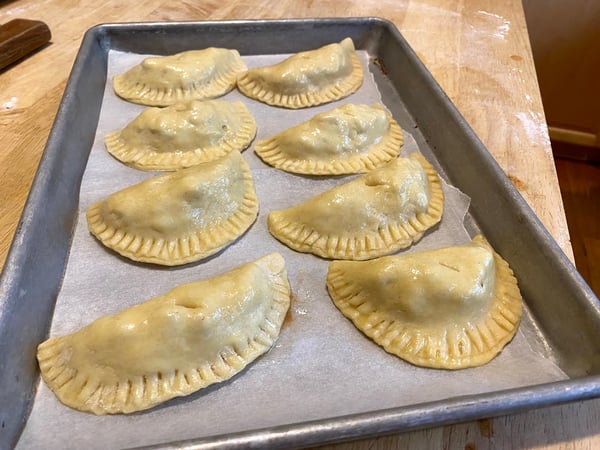 10. Place the empanadas on the prepared sheet tray, and lightly brush the tops with egg wash. Using the tip of a paring knife, make a small steam vent in the top of each empanada.