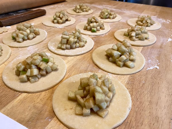 Spoon about 1 tablespoon of the apple filling in the center of each circle of dough, brush the edges with egg wash, and fold the dough into a half-moon over the filling.