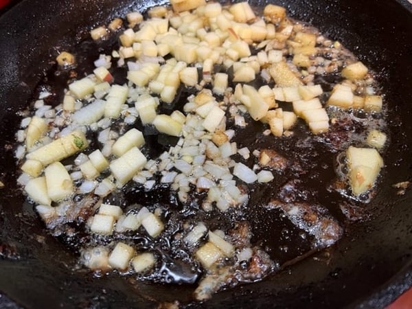 6. Turn the heat to low, add butter, onion, and apple and saute 2-3 minutes.