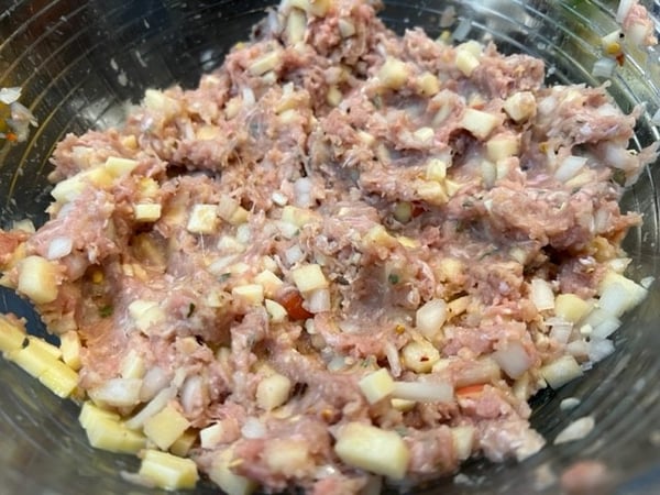 - In a medium bowl mix ground turkey, panko, red pepper flakes, cheese, apple (3/4), onion (1/2), sage, egg, salt and pepper.