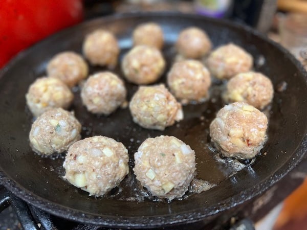- Add in the meatballs and allow them the brown on all sides, rotates every 3-4 minutes. You may have to work in batches.