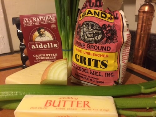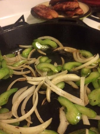 I thought I had some shrimp in the freezer, but only had andouille sausage, so I went with that. I also felt like I needed to add a little texture (aka vegetables) to my meal, so I sautéed some onion and celery.
