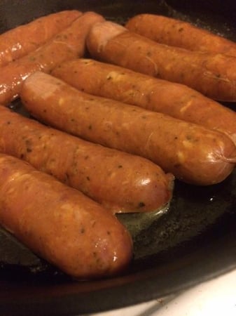 While the grits were cooking, I grabbed my trusty cast iron skillet to cook the andouille sausage.