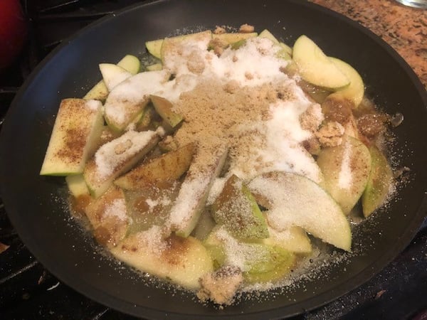 4. Once the butter is melted add the apples, cinnamon, brown sugar, and granulated sugar.