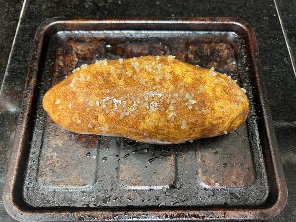 Then, I coat the outside with coarse sea salt and bake at 375 degrees F for about an hour or until a knife can easily be inserted through the potato.