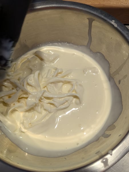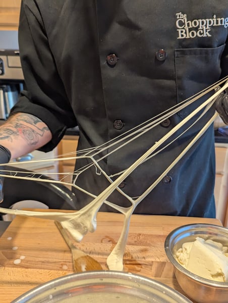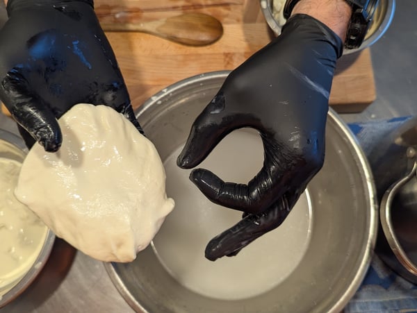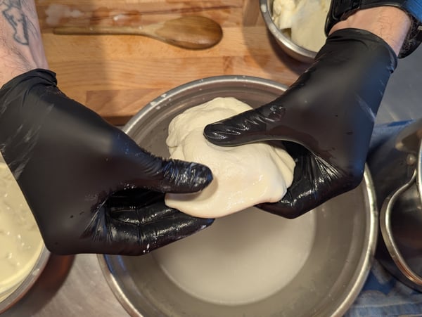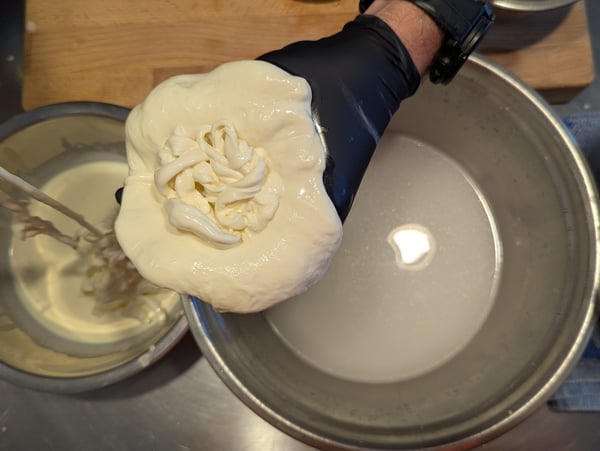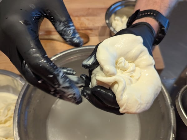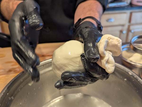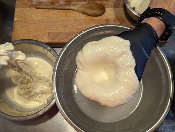 1. Prepare your mozzarella: If you're using freshly made mozzarella, allow it to cool slightly but remain pliable. If you're starting with fresh curd, you'll need to go through the melting and stretching process as outlined in our mozzarella recipe. Don't aim for perfect balls this time; a warm, smooth mass of mozzarella is what you need.