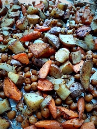 - Mix harissa mixture with vegetables, garlic cloves and chickpeas and spread in a single layer on prepared baking sheet.