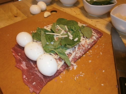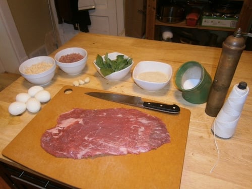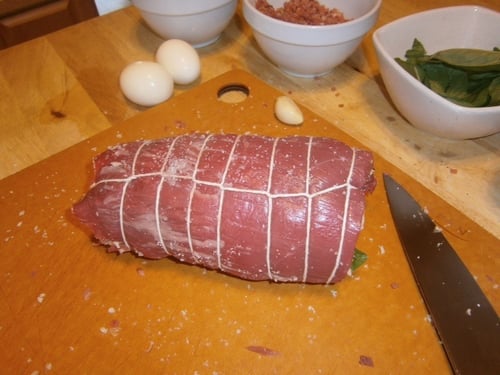 4. Roll up the flank steak so you have a snug roulade. With the seam on the bottom, secure the roll using butchers twine. (You can do all of the above steps a day in advance!) Season the outside of the roll with salt and pepper to taste.
