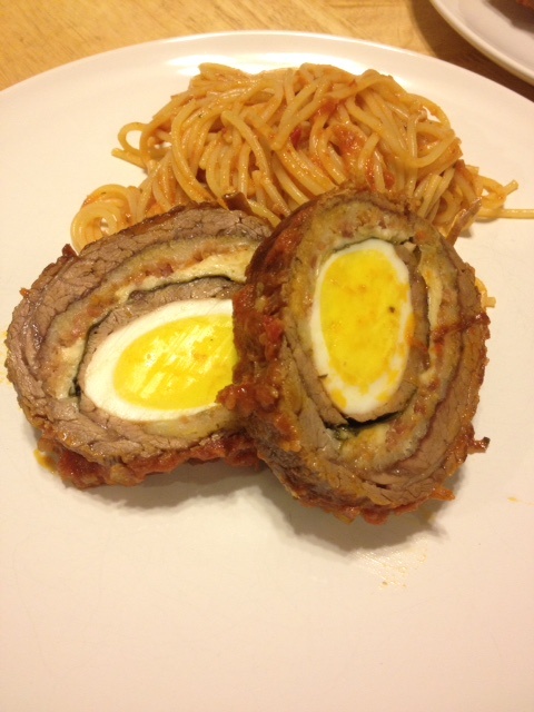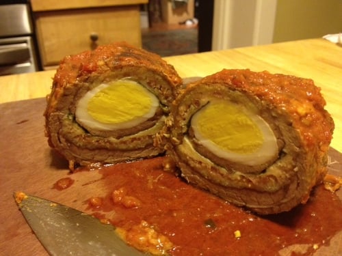 Braciole, pronounced bra'zhul, is a soul-satisfying dish that hails from Italy. It consists of a thin piece of meat, breadcrumbs, prosciutto, cheese and sometimes, but not always, hard-boiled eggs, all rolled up and simmered gently in tomato sauce for hours until tender. When we make braciole at our house, hard boiled eggs always make an appearance. Our kids innocently wonder how an egg made its way inside the meat!