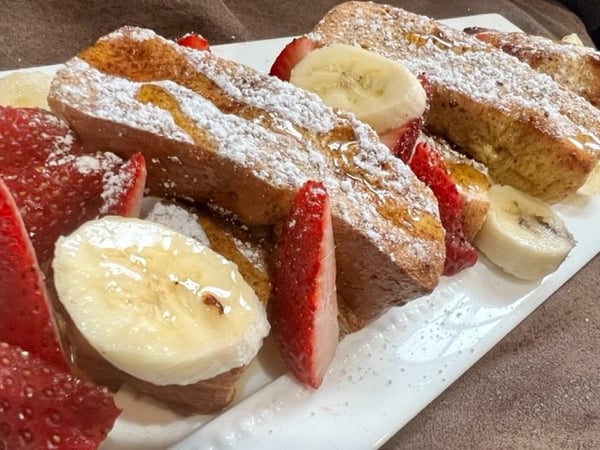 - While the French toast is in the air fryer, slice the strawberries and bananas.