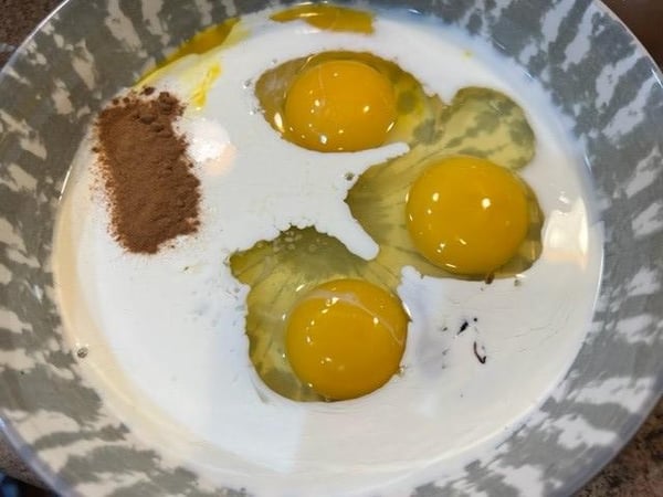 - In a shallow bowl, whisk together eggs, heavy cream, milk, cinnamon, vanilla bean paste, salt, and sugar (you could even add a splash of bourbon or Grand Marnier if the mood moves you).