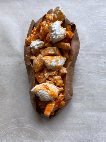 - While the sweet potato bakes, simply cook the chicken in a skillet with the grapeseed oil for 3-4 minutes, remove from heat and toss in the hot sauce.